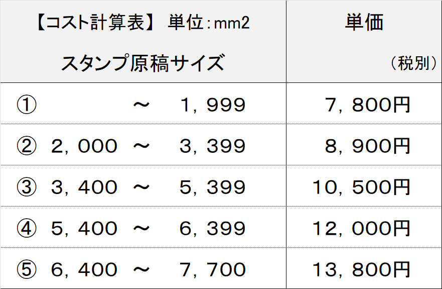 The cost of stamp production varies depending on the area of the mark design (length x width in mm).
