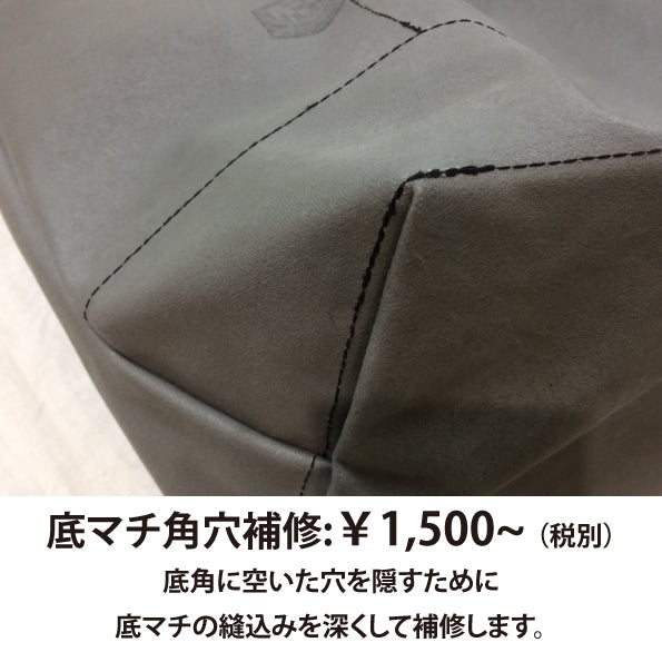 【修理】バッグの底マチ角に穴が空いた場合、マチ部分の縫込みを深くして穴を隠す補修が出来ます。*マチ幅がその分広くなります。