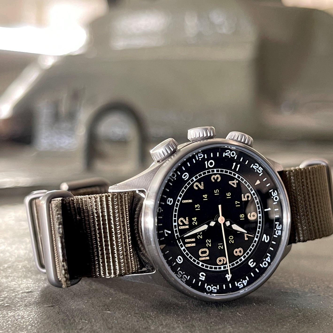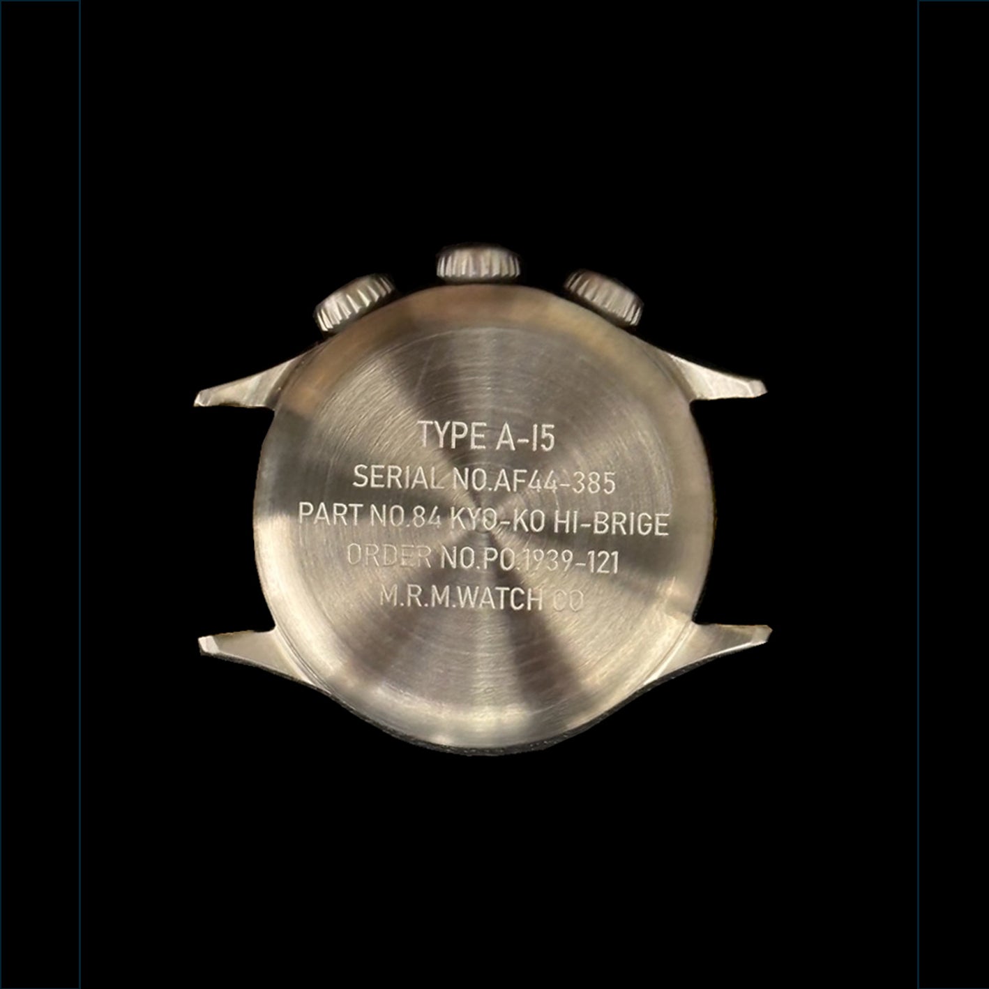 1944年まだ空軍がなく陸軍に属する⽶陸軍航空隊USAAF(United States Army Air Forces)と呼ばれていた頃開発されたType-A15パイロットウォッチをリプロダクションしたモデルです。 最⼤の特徴は上下のリュウズと連動している回転式リムアキュムレーターを搭載している事です。この2つの回転盤によって、33mmと径が⼩さいにもかかわらず、⾶⾏経過時間や2カ国時刻を表す事が可能とした多機能時計です。