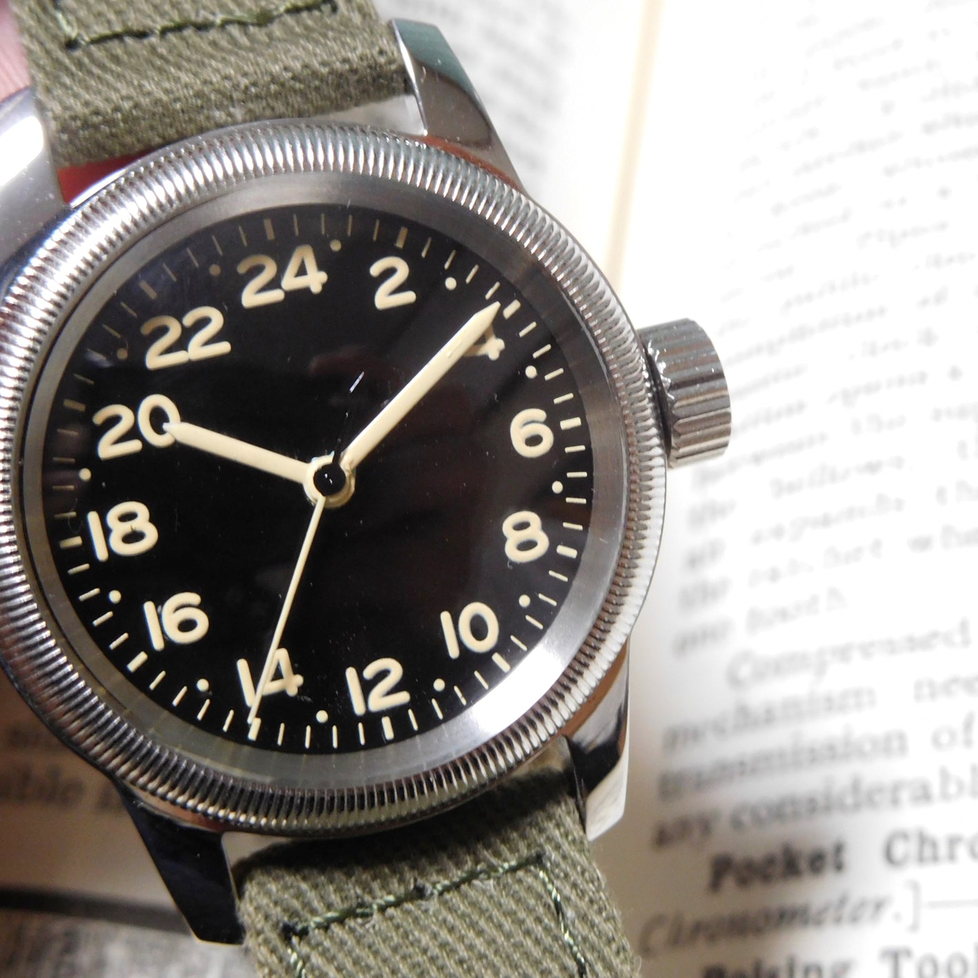 米陸軍航空隊が使用したType-A12 24時間表示文字盤のナビケーション・パイロット時計のリプロダクション・モデルです。現在日本のクオーツムーブメントでは24時間ムーブメントを製作していない為、スイスRONDA社のムーブメントを使用してます。
