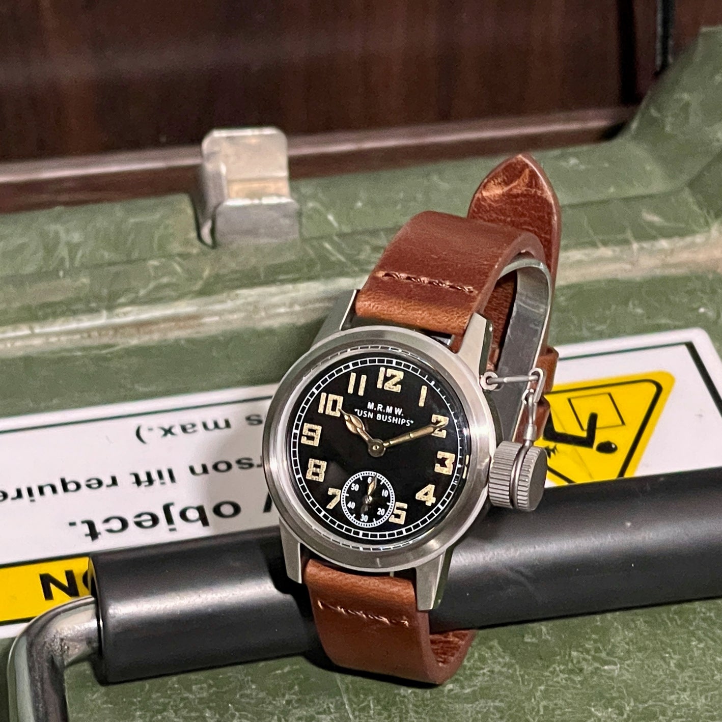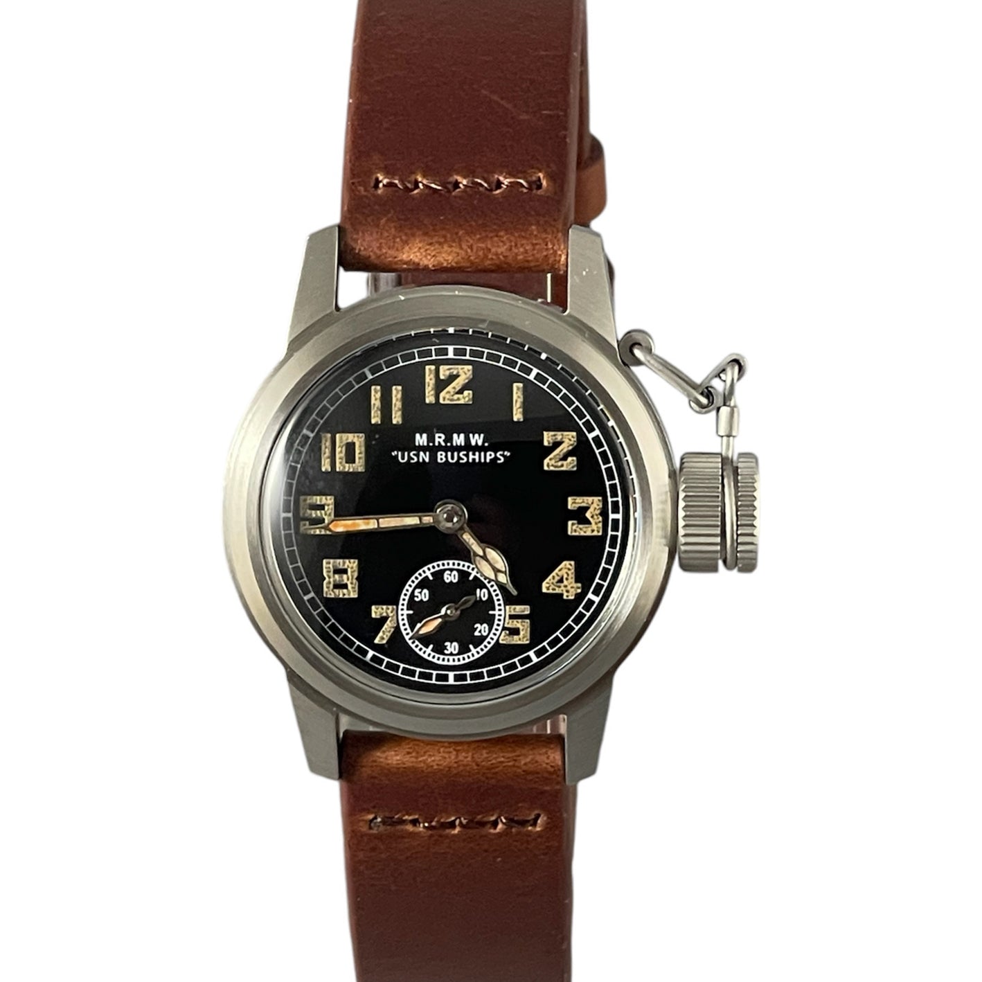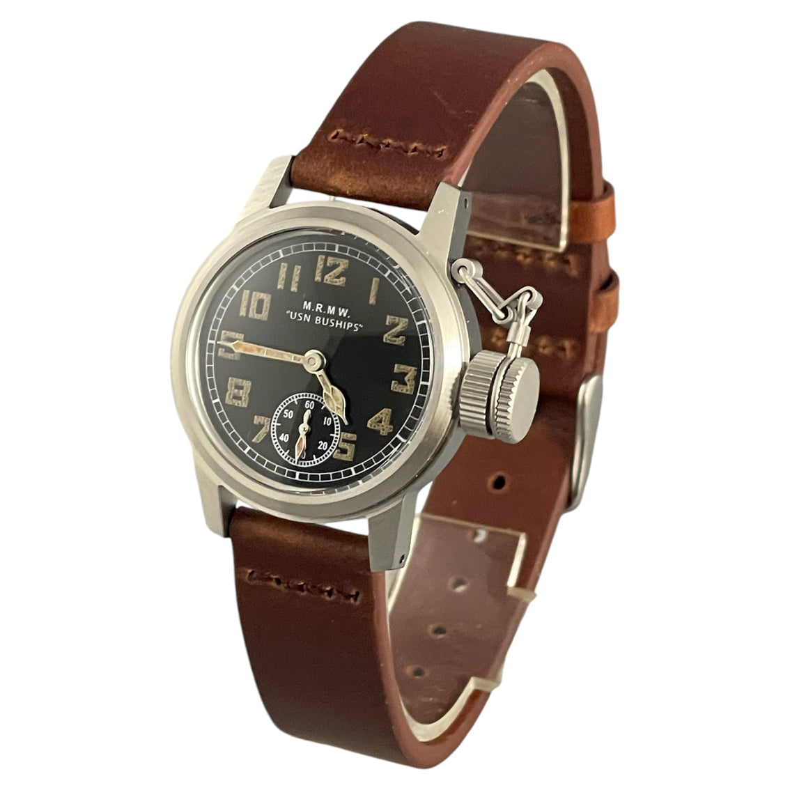 U.S.N. BUSHIPS HAMILTON風のリプロダクション・モデル・ウォッチです。スモールセコンドの⽂字盤に、オフィサースタイルの⾰ベルト仕様です。