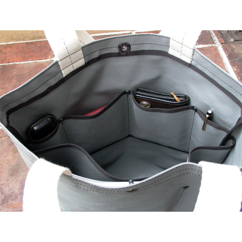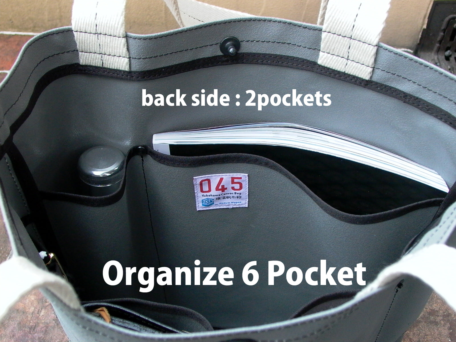 ハンドル長さ50cmで肩掛けも楽々。6つの区分けポケット付きでA4雑誌など収納可。