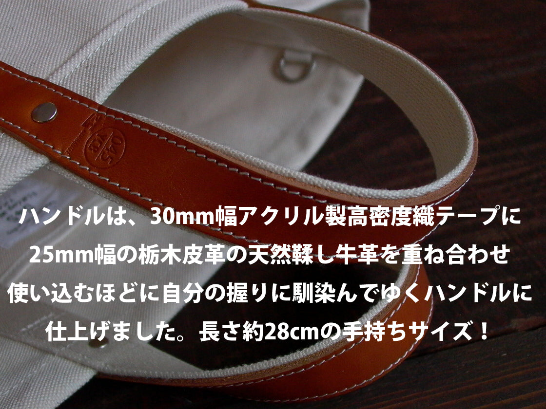 洗い染色加工したソフトな綿4号帆布を使用。バッグ底面の底あてに防水性の軽量帆布(Airsky)を使用しお手入れ楽々。